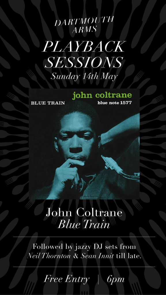 Sunday 14th May will be the last of my Playback Sessions at Dartmouth Arms NW5 for a while. I will be back later in the year and meanwhile there will be others carrying on the vinyl-only listening tradition. But the final one from me (for a bit) is a play-through of Coltrane’s Blue Note album Blue Train. That’s not to say we won’t dip into Crescent, My Favourite Things, A Love Supreme and so on. We will draw the line at the Ascension and Interstellar Space era. After all, we’d like people to stay. Blue Train, though, is hugely accessible and we are using the fantastic “Ultimate” version released last year. I’ll be in conversation with sax player Danny Silverstone of the Equinox Quartet (see https://mylifeinjazz.co.uk) , who will help steer us through Coltrane’s changes. As it says below, May 14, 6pm, free.